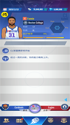 角色能力值随赛事表现动态调整,每周安排战术训练与专项特训提升控球、三分等专项数值。生涯历程中会触发媒体采访、商业代言等事件,真实还原职业球员成长轨迹。